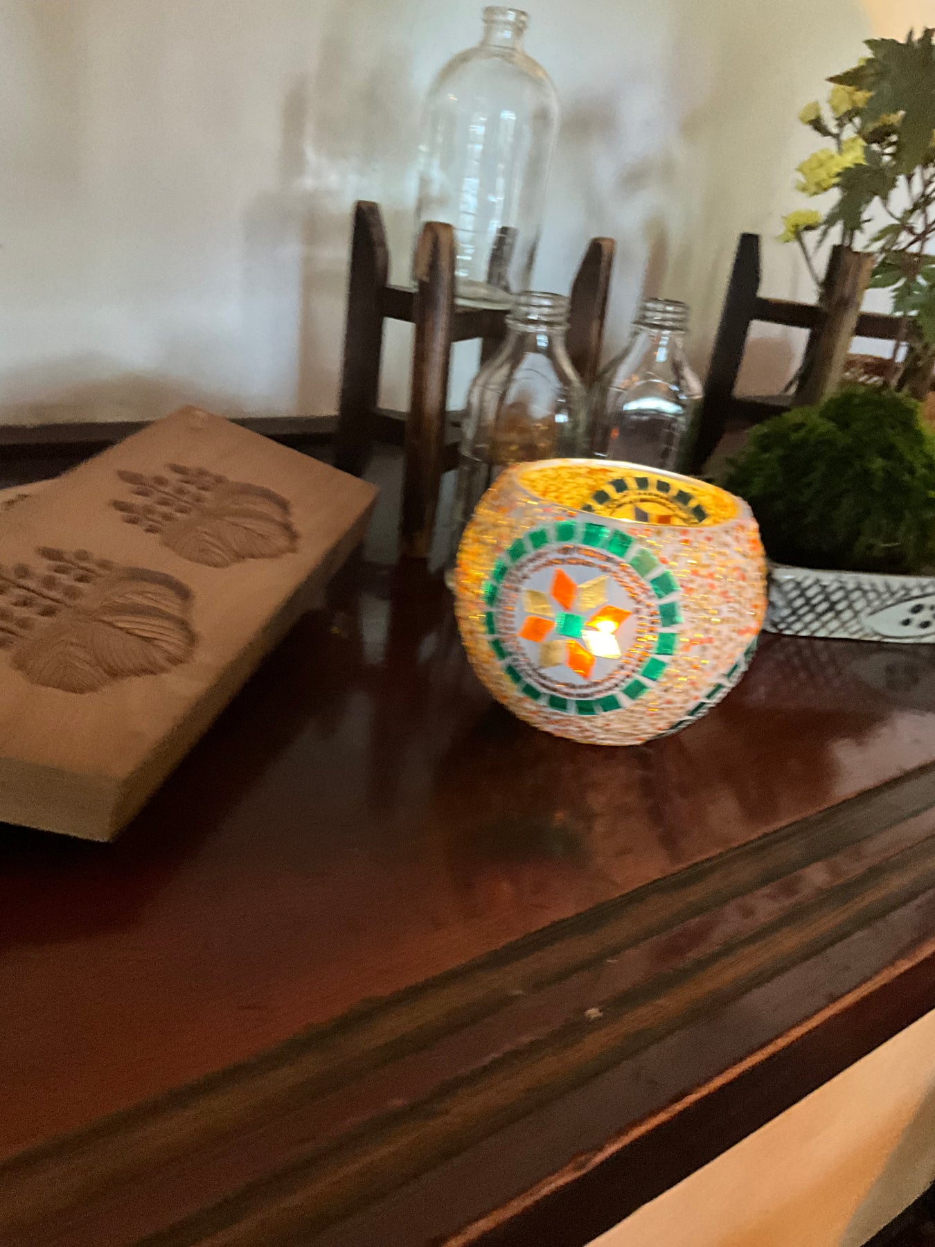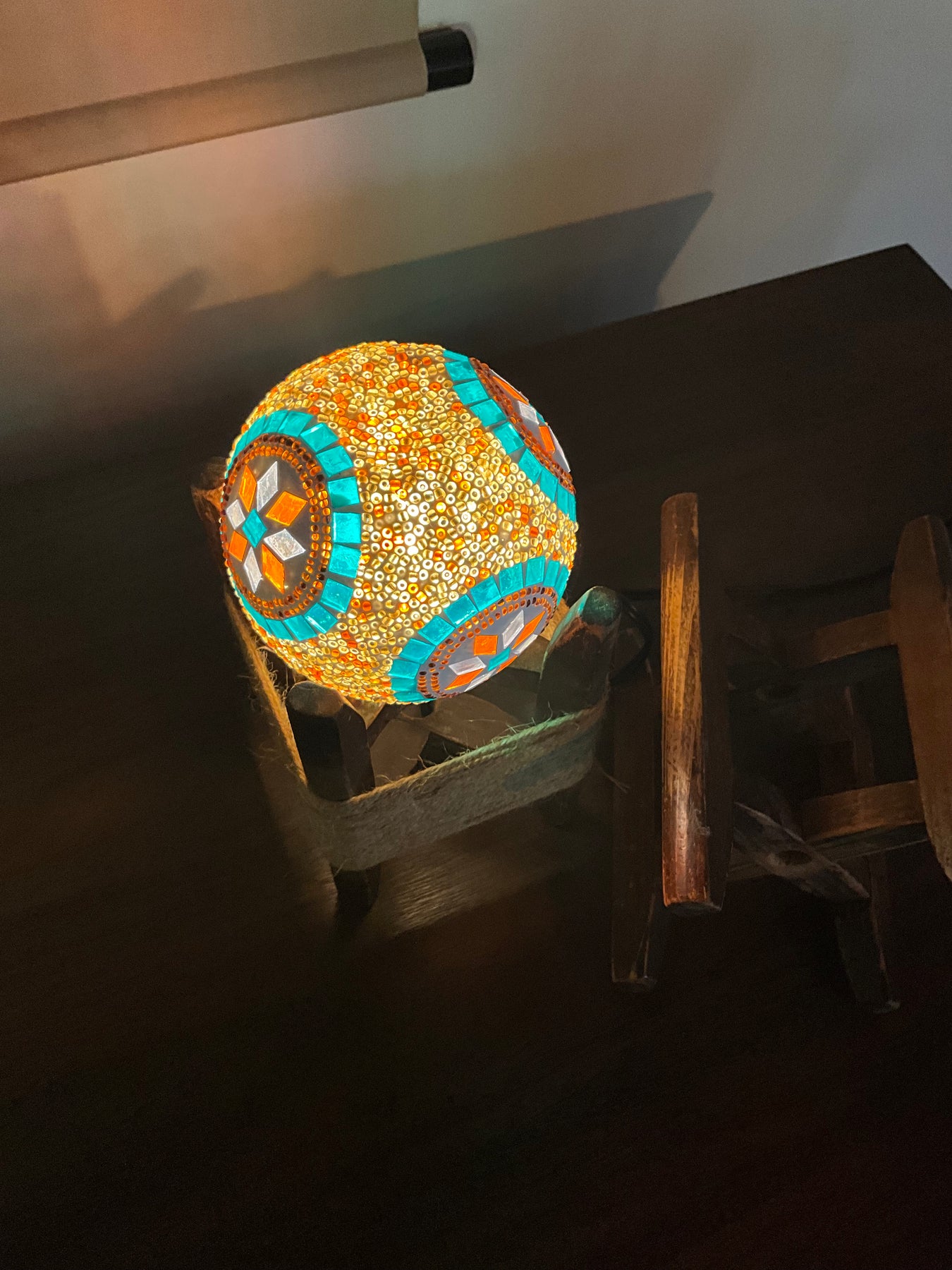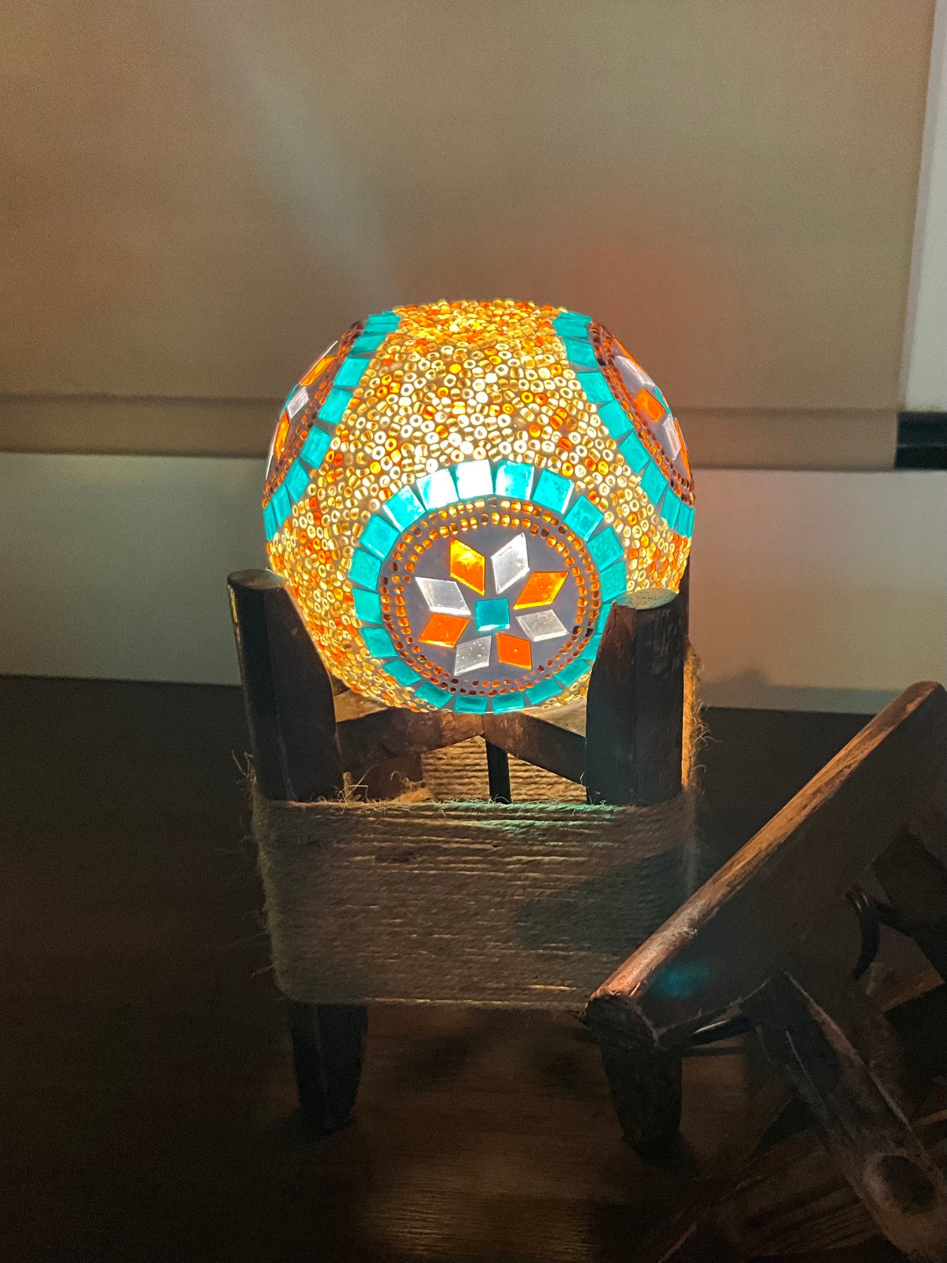 ゴールド、オレンジ、ブラウンの温かみがあって、落ち着いた雰囲気の作品です。ターコイズのタイルがデザインをより引き立たせてくれています。洋室だけでなく和の雰囲気にも良く合います。電気スタンドを使用して(画像1、2枚目)煌びやかな灯火も良し、ロウソクを使用して(画像3枚目)揺ら揺らと幻想的な灯火も良し...色々な使い方でお楽しみください。