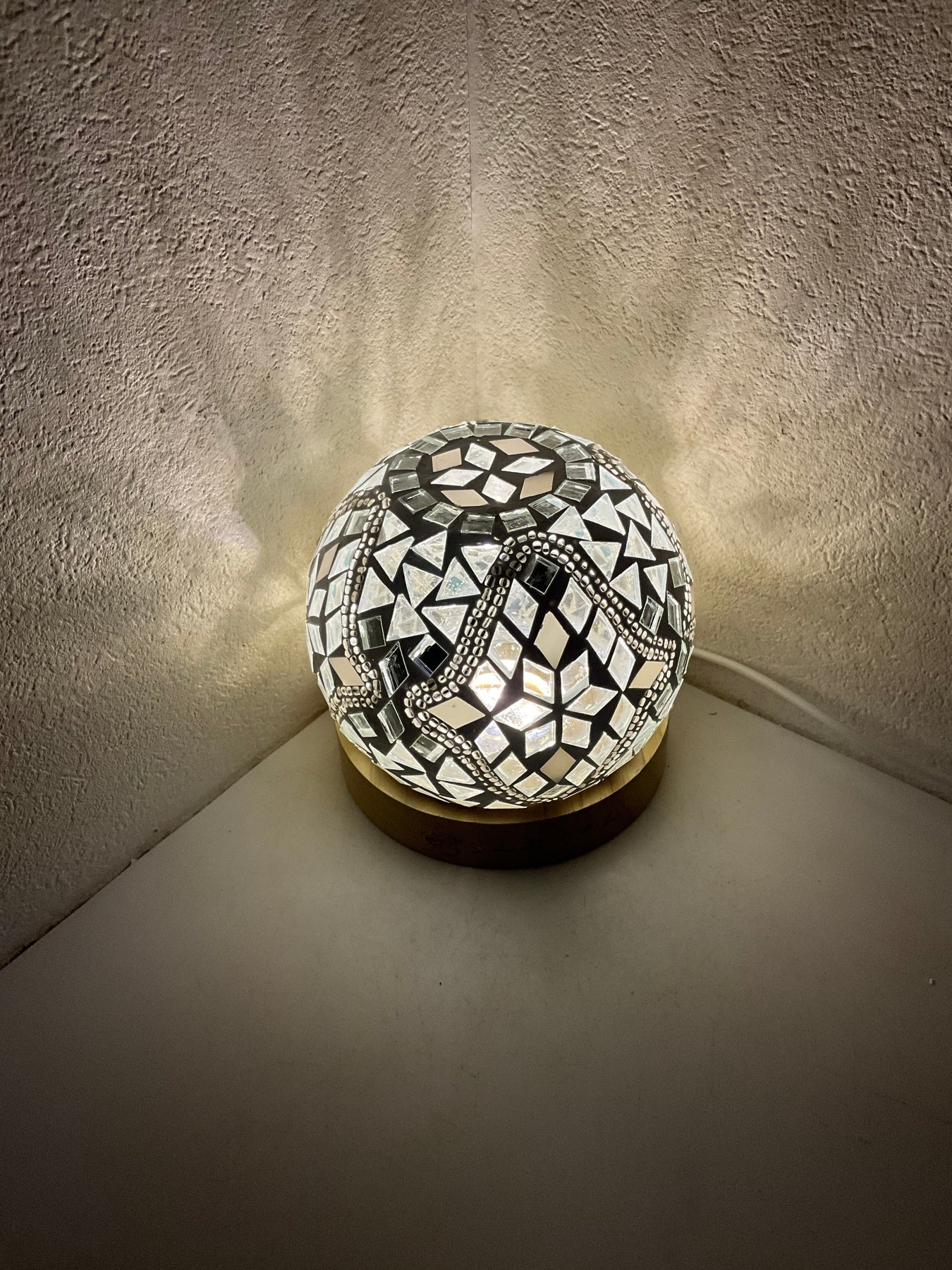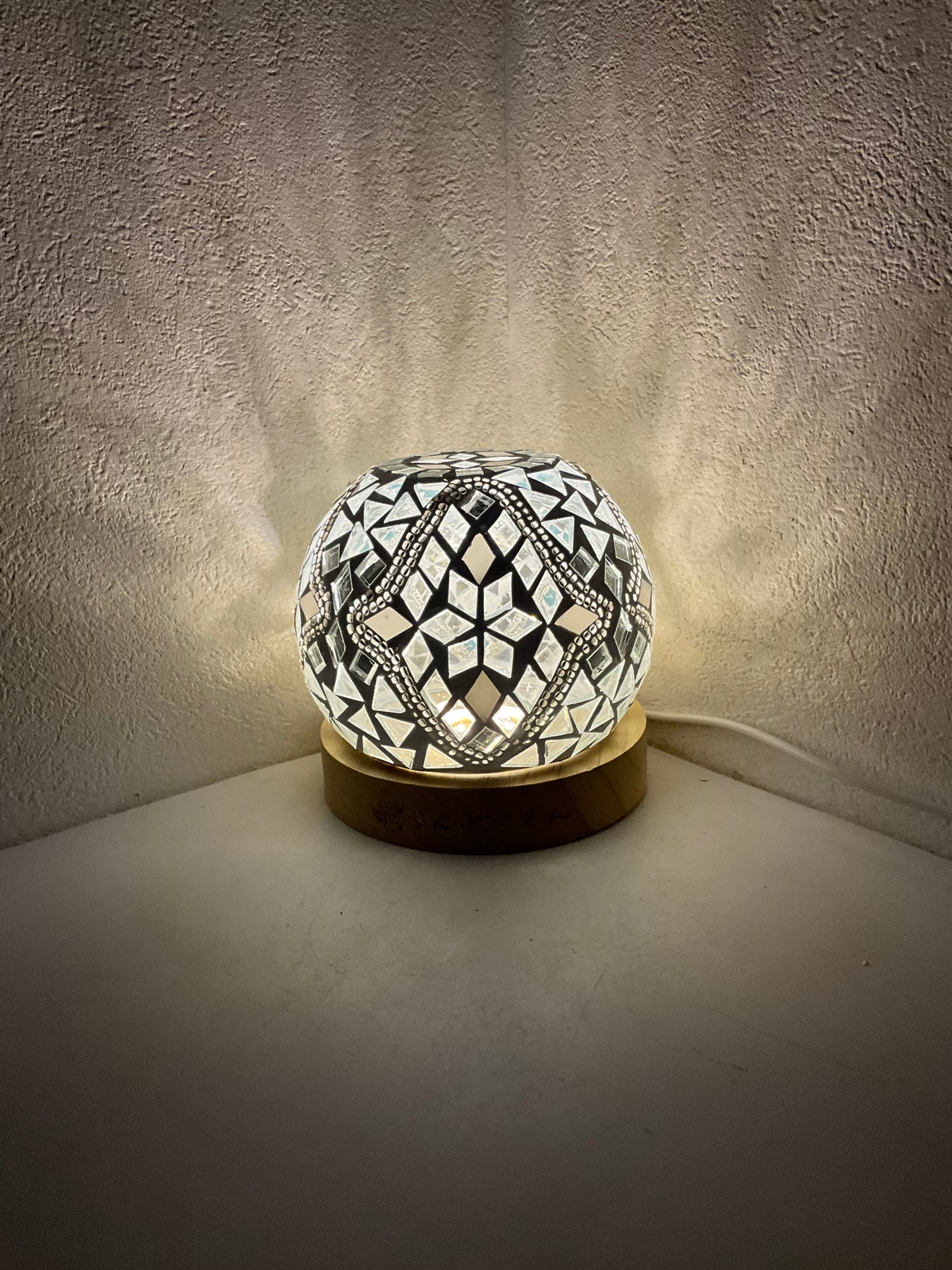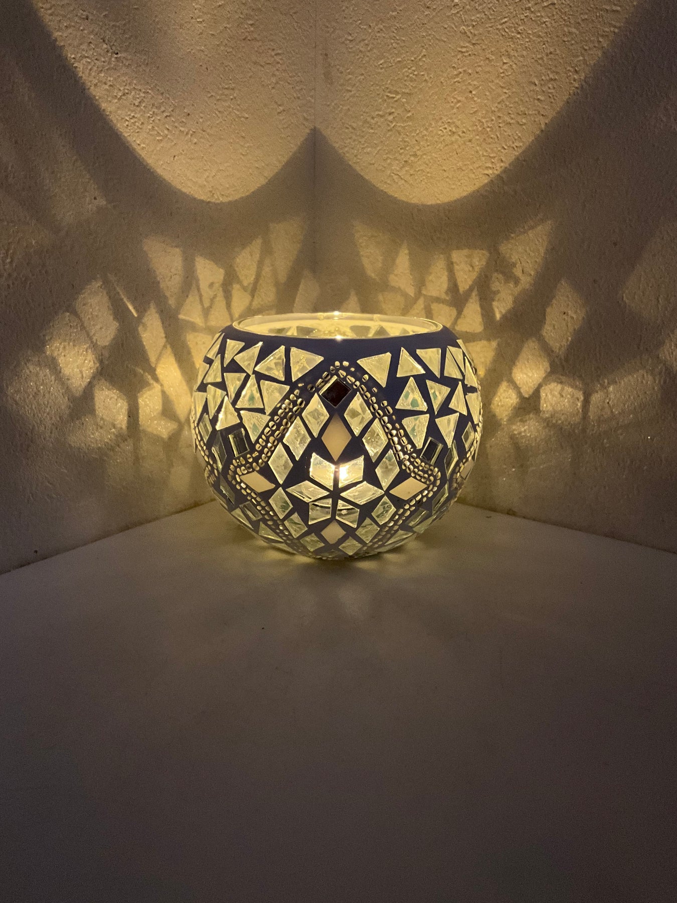 ほとんどがクリアのタイルなので、とても明るい作品となっております。電気スタンドを使用した際は本を読んだり、書き物をする際の手元を照らすのにもいいかもしれません。電気スタンドを使用して(画像1、2枚目)煌びやかな灯火も良し、ロウソクを使用して(画像3枚目)揺ら揺らと幻想的な灯火も良し...色々な使い方でお楽しみください。