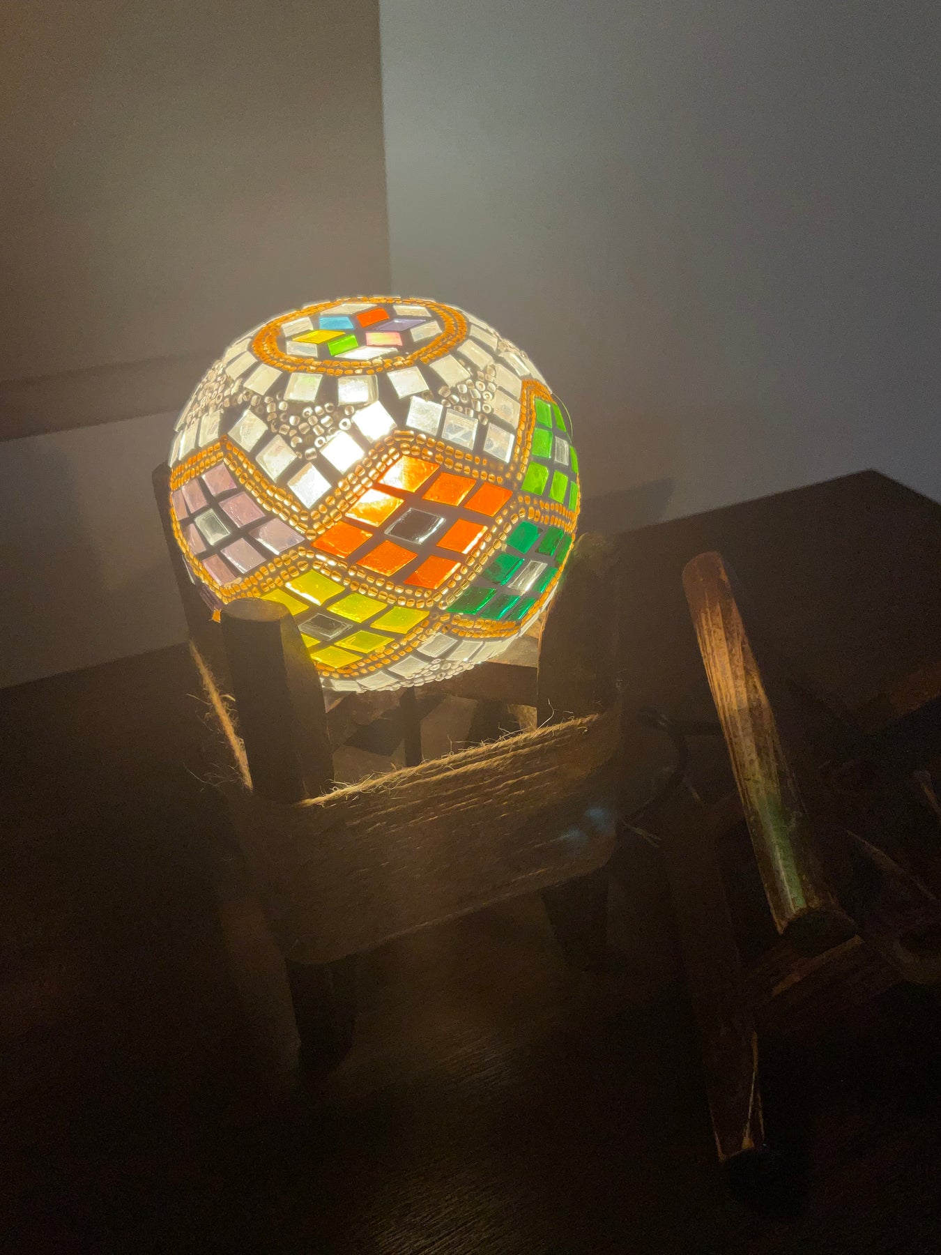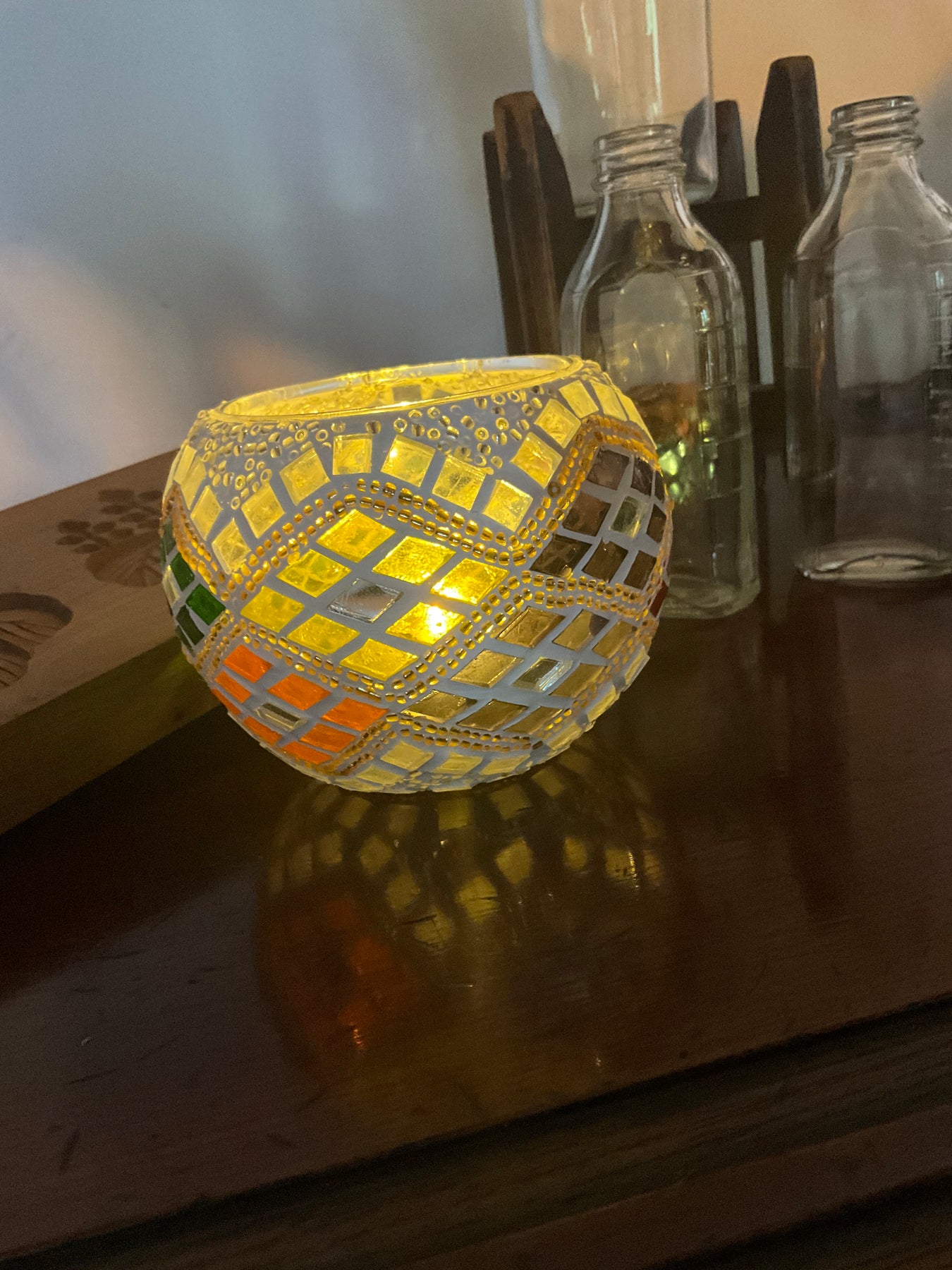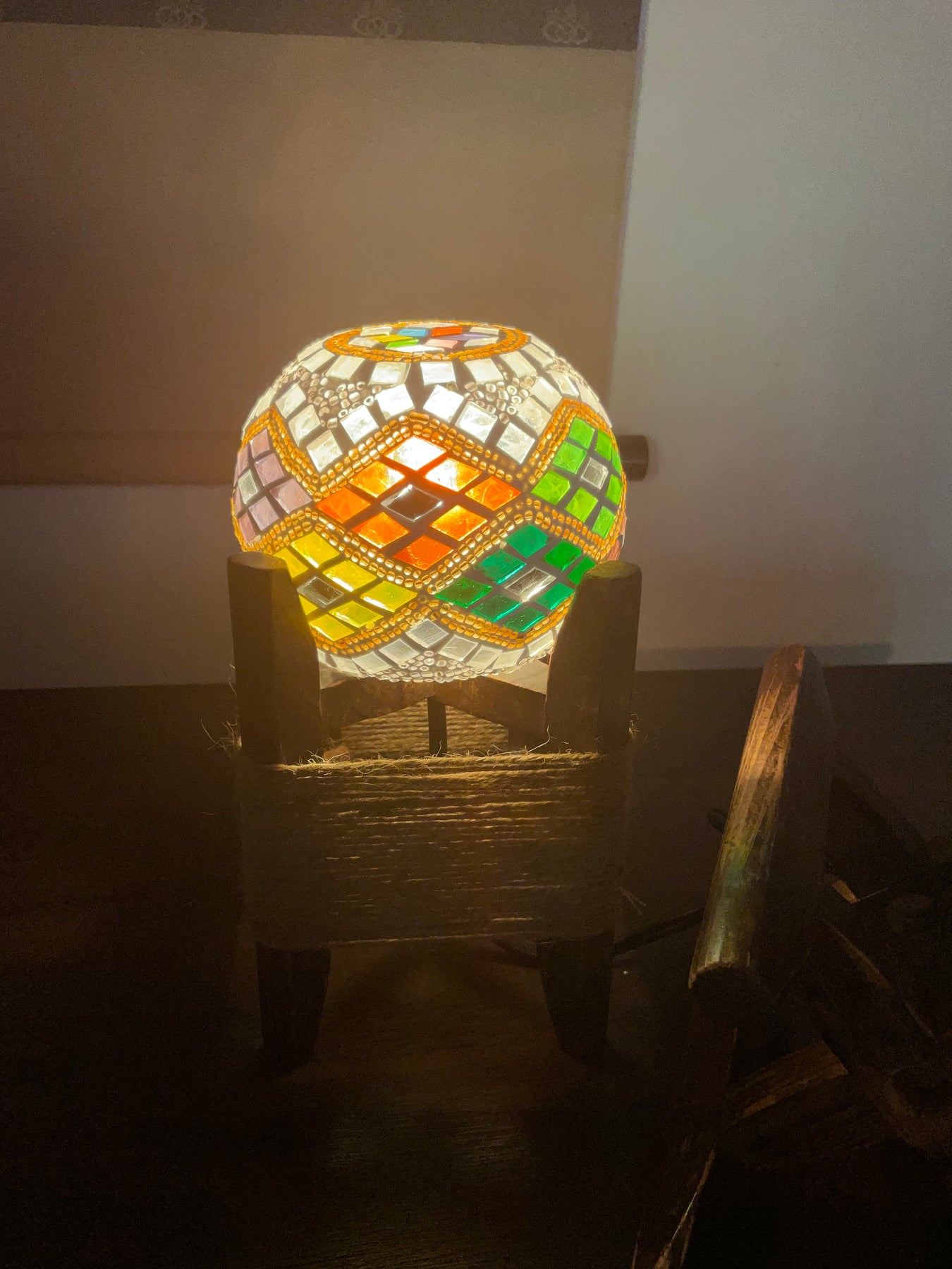 デザインはシンプルな帯ですが、カラフルなので見る面で印象が変わるキャンドルホルダーです。電気スタンドを使用して(画像1、2枚目)煌びやかな灯火も良し、ロウソクやティーライト使用して(画像1枚目)優しく揺ら揺らと幻想的な灯火も良し・・・色々な使い方でお楽しみください。