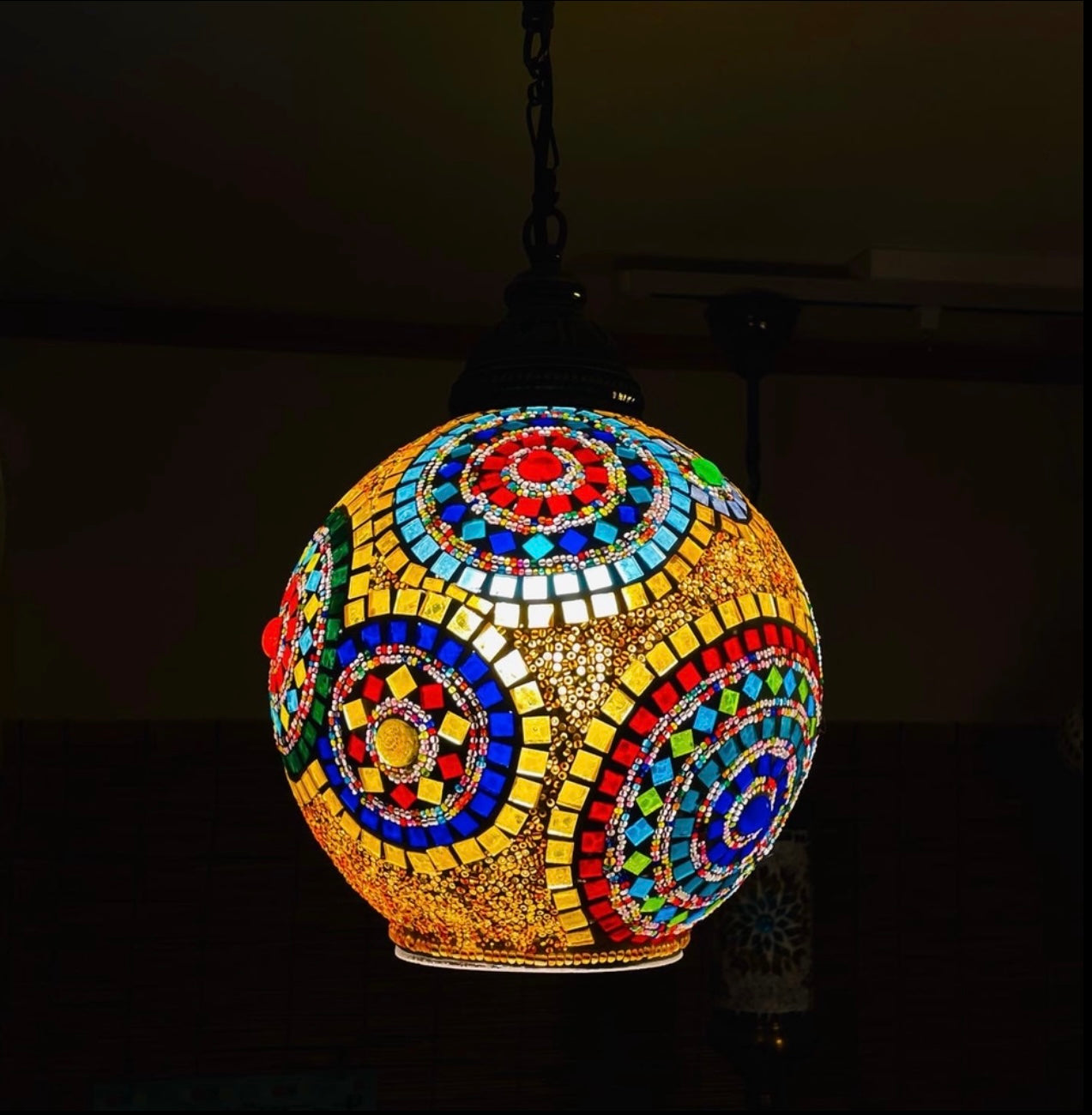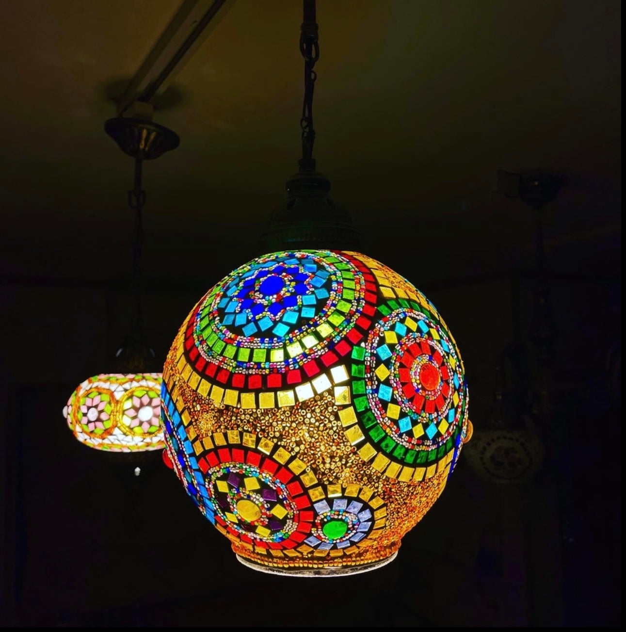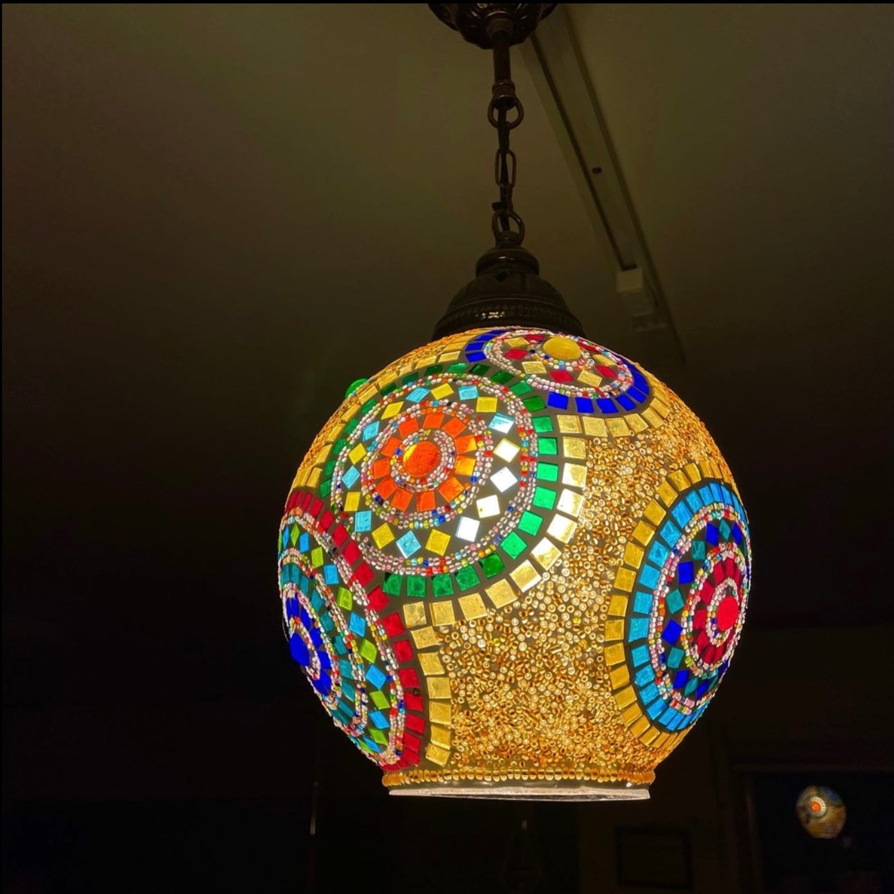 直径22cmの大きなまん丸ランプシェード。丸いフォルムが可愛い人気のペンダントランプです。まん丸ホヤに鮮やかなまん丸デザイン。和にも洋にも合うと思います。ゴールドの粒ビーズで仕上げたのでとってもゴージャス。ホヤの下に金具を付けることも可能です。