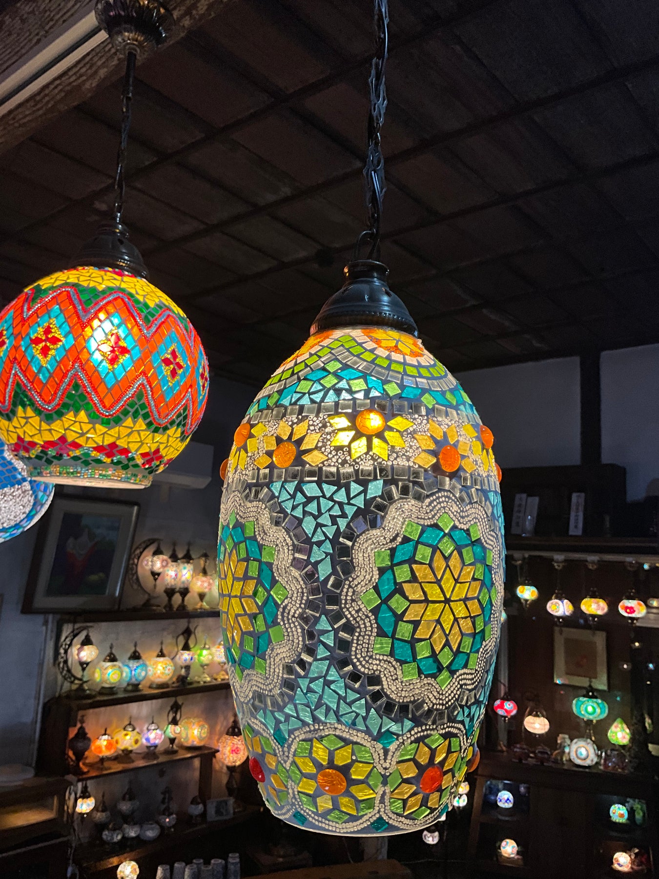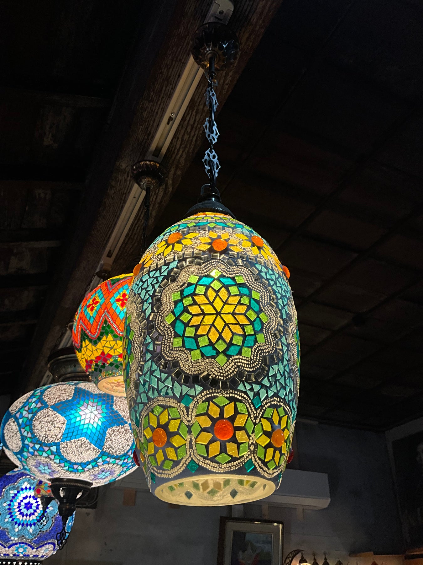 つりがねのような形の大きなホヤに、爽やかな色合い...癒しカラーで制作。モザイク感たっぷりの可愛いランプです。お気に入りの場所に吊るしてみませんか?チェーンの長さは調整致します。ご相談ください。また、お色違い等のオーダーも承ります。お気軽にお問い合わせください。
