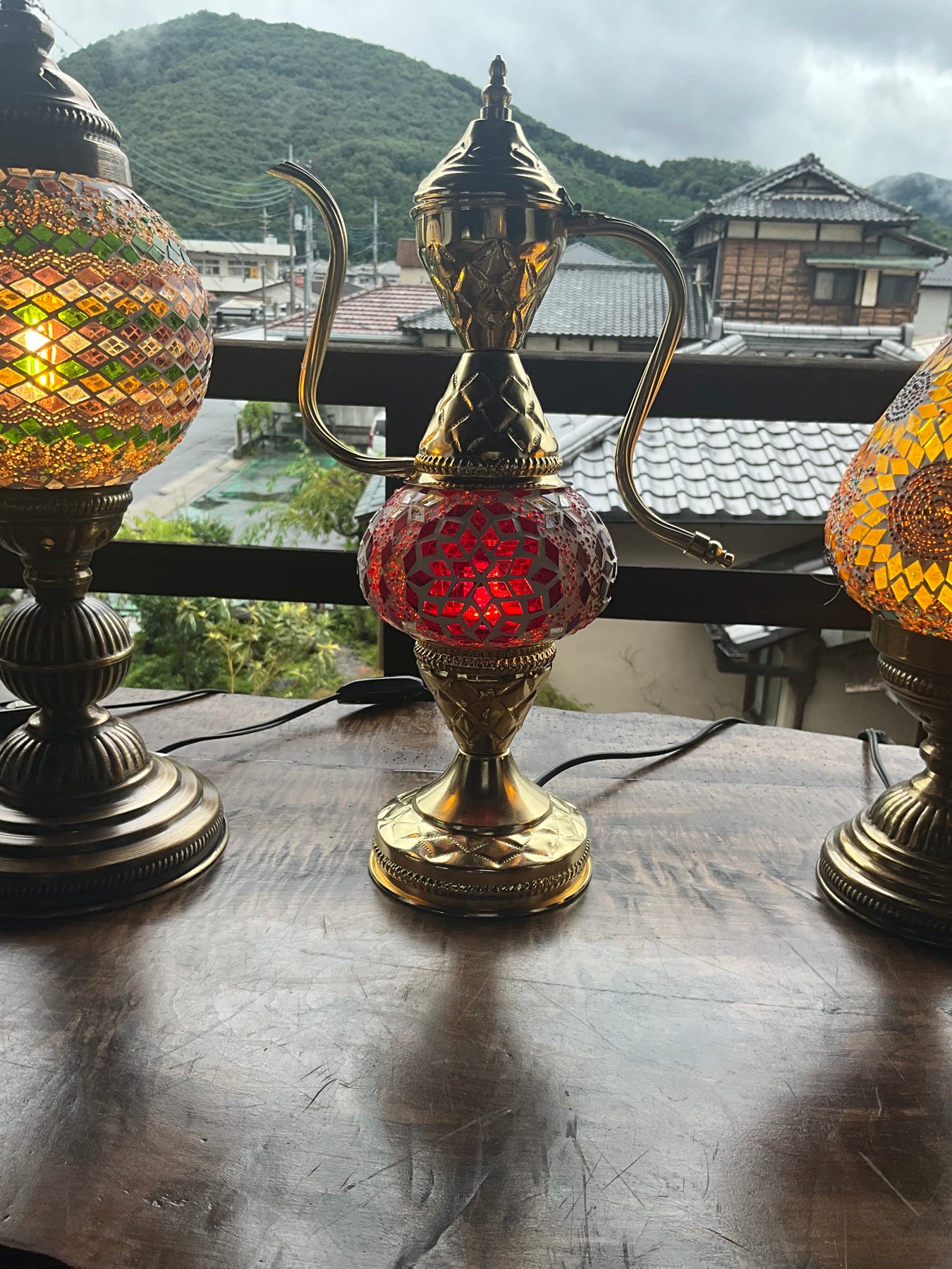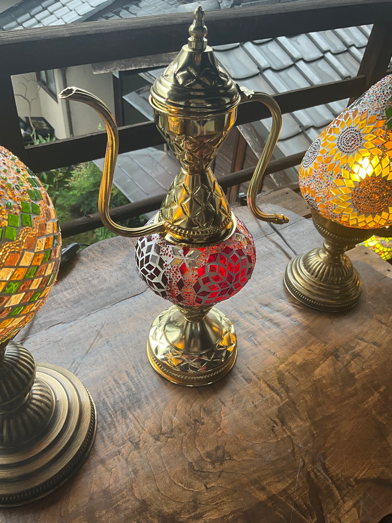 豪華なゴールドの水差し型のフレームに鮮やかな赤い灯火が目を惹くランプです