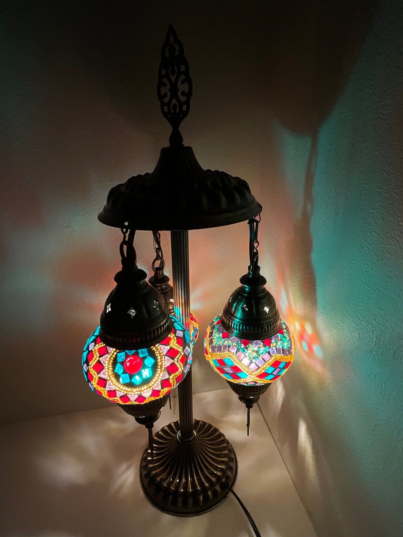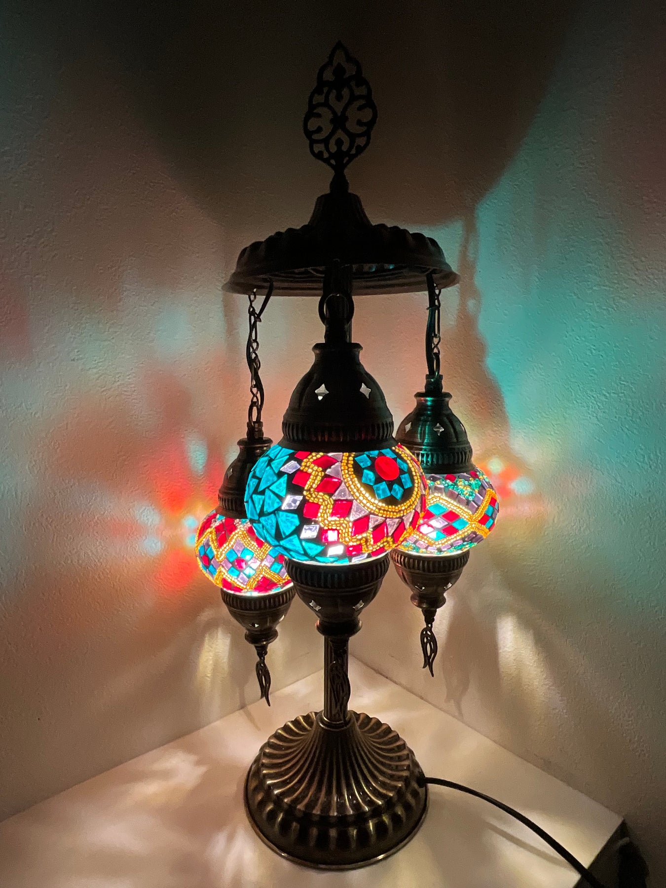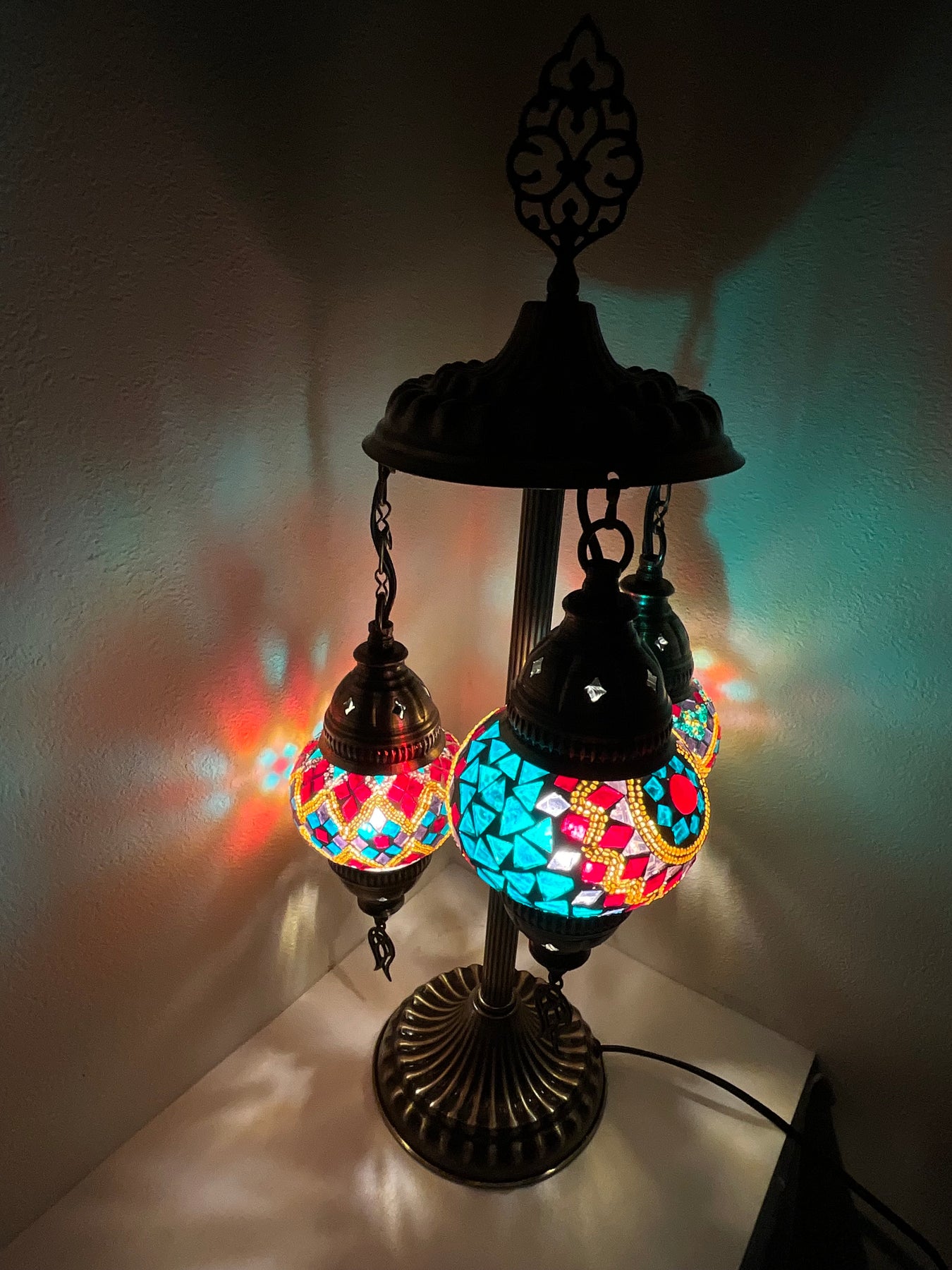 置き型シャンデリア。Sサイズ(直径12cm)のランプシェードが3つ付いたすっきりとしたスタイルのランプです。吊るすタイプはシーリングや補強が必要になったり...置き型タイプならコンセントさえあればどこでも楽しめます。3つのデザイン違いのランプで色使いにも華やかさがあります。背の低いタイプなので比較的置き場所も困らず、カウンターや出窓、デスクの上に置いて楽しめます。